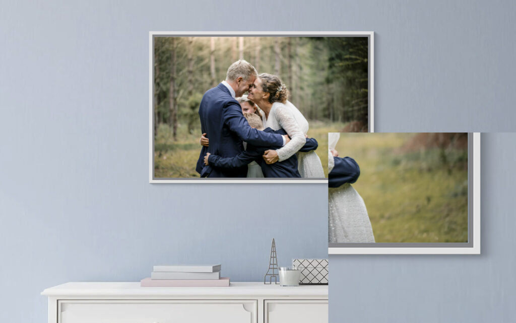 Når jeg leverer dine billeder, har jeg nemlig ofte allerede et udkast af dit mulige vægdesign inde i mit hoved, mens jeg redigerer dem. For mig er det ikke uoverskueligt men noget jeg elsker at nørde med. Ud fra dét, dine favoritter og med de værktøjer jeg bruger til dagligt, kan jeg designe din helt personlige billedvæg. På den måde kan du se billedernes sammensætning på en væg – inden du bestiller.